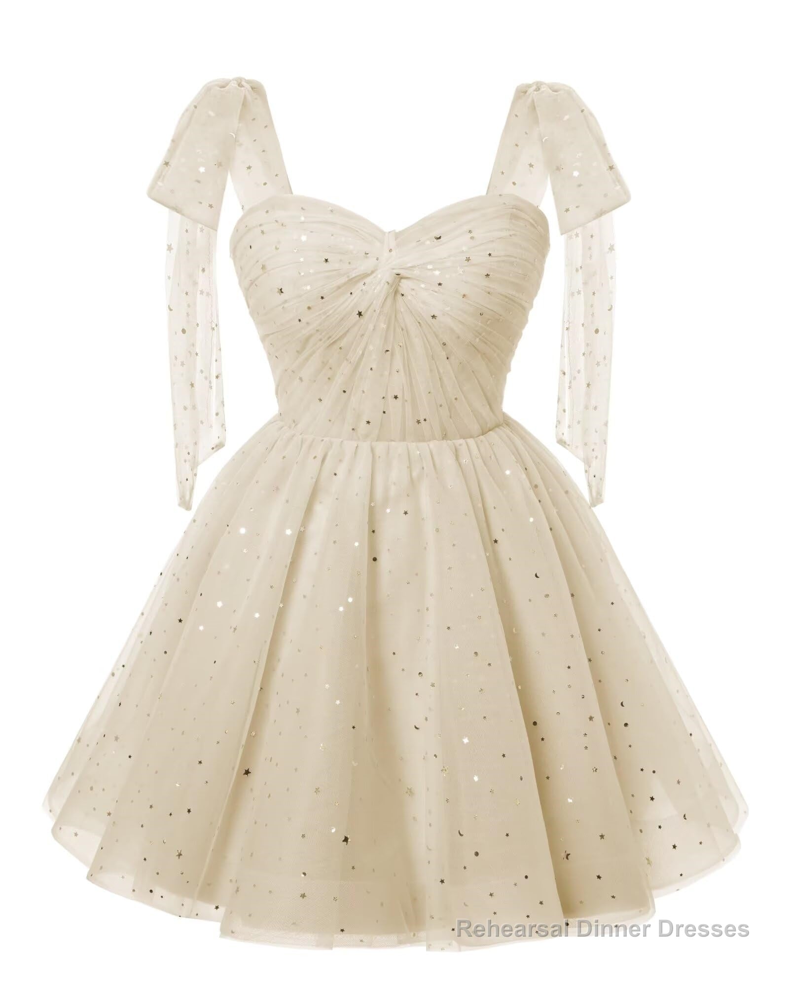 Sparkly Starry Light Champagne Tulle Short Homecoming Dresses Spaghetti Bow Straps Prom Dress Sequin Cocktail Party Dress for Teens