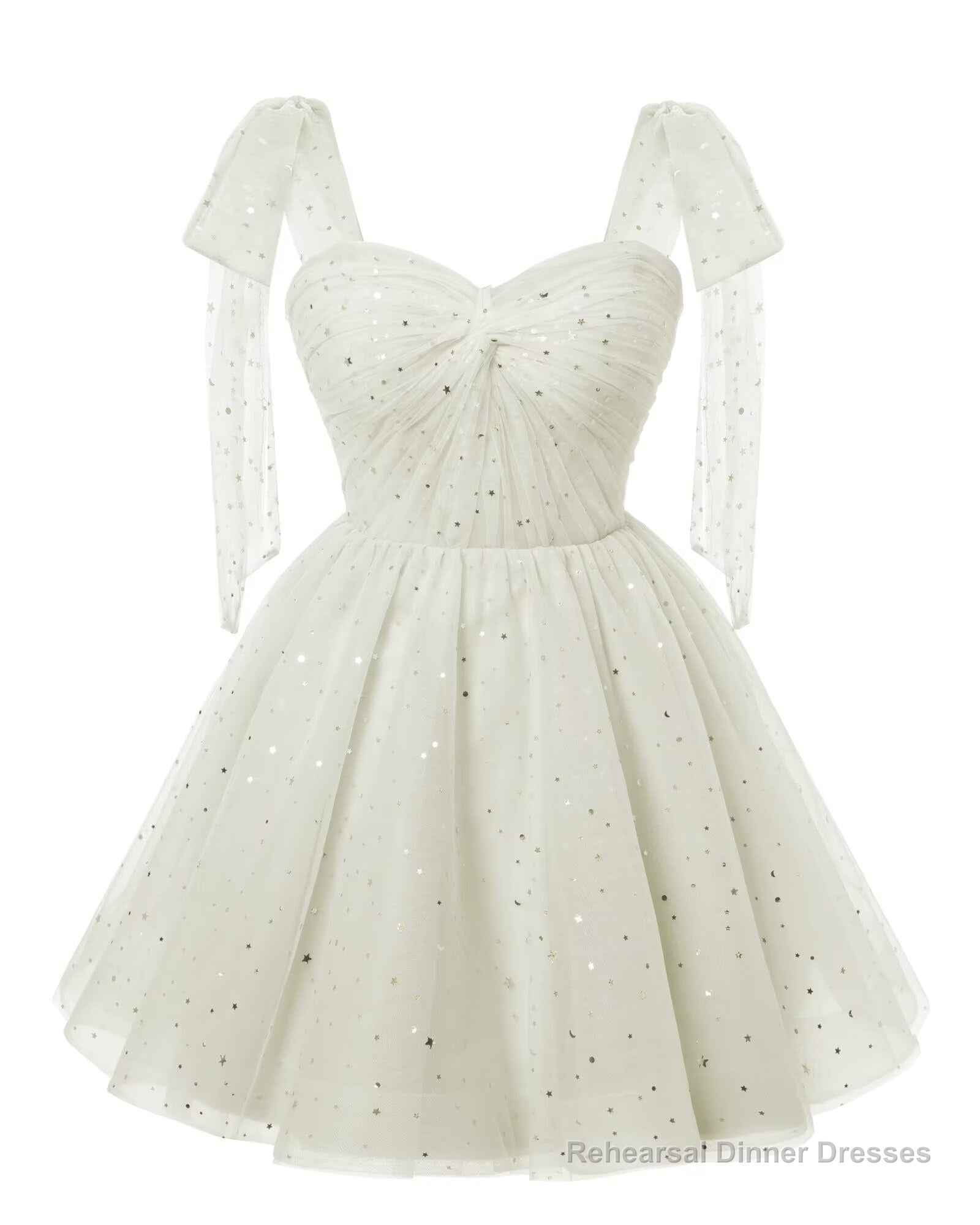 Sparkly Starry White Tulle Short Homecoming Dresses Spaghetti Bow Straps Prom Dress Sequin Cocktail Party Dress for Teens