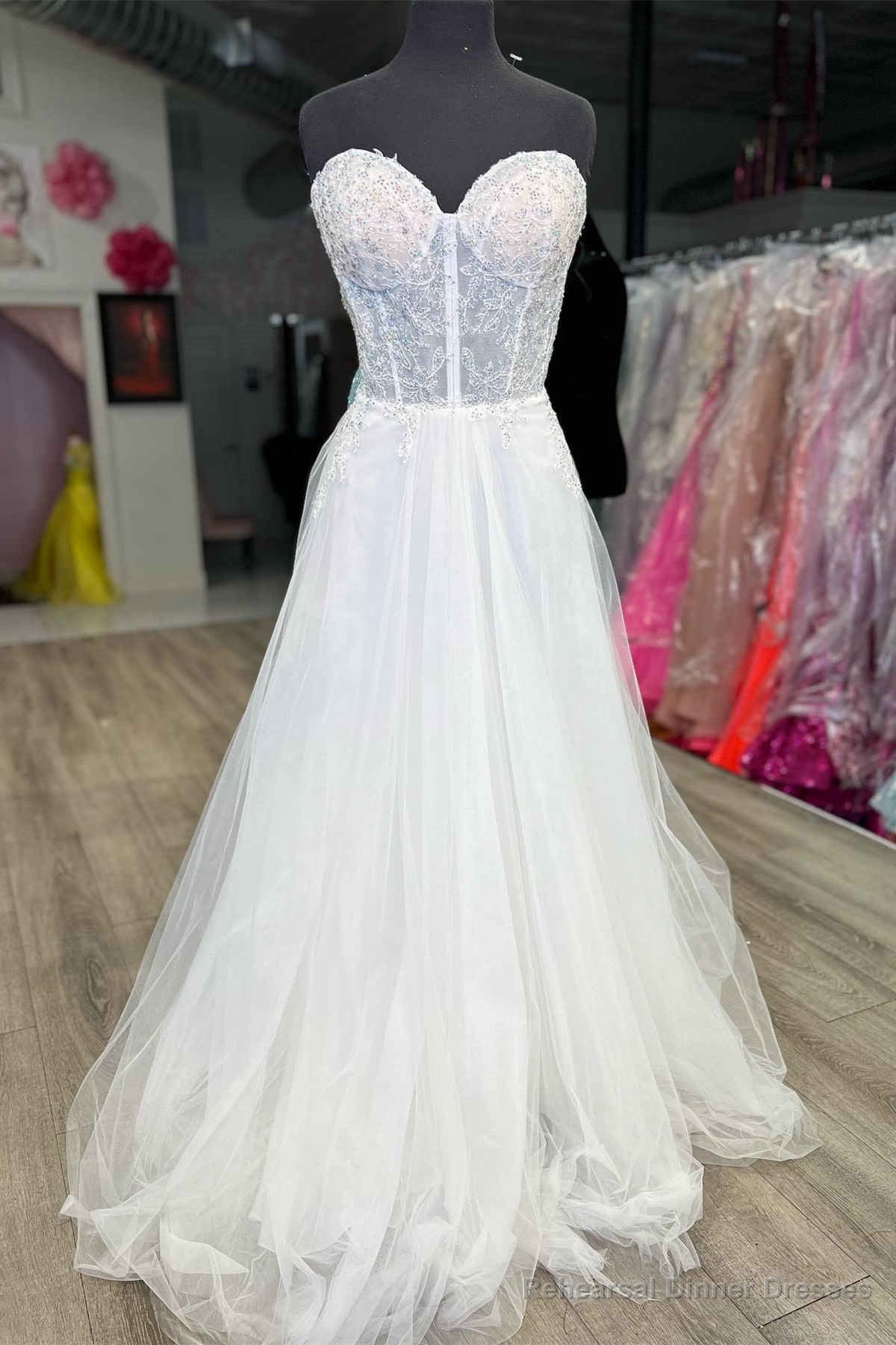 Strapless White Lace Corset Long Formal Dress with Rhinestones