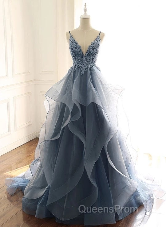 Tulle Long Evening Prom Dress With Spaghetti Straps And Ruffled Floor Length Skirt