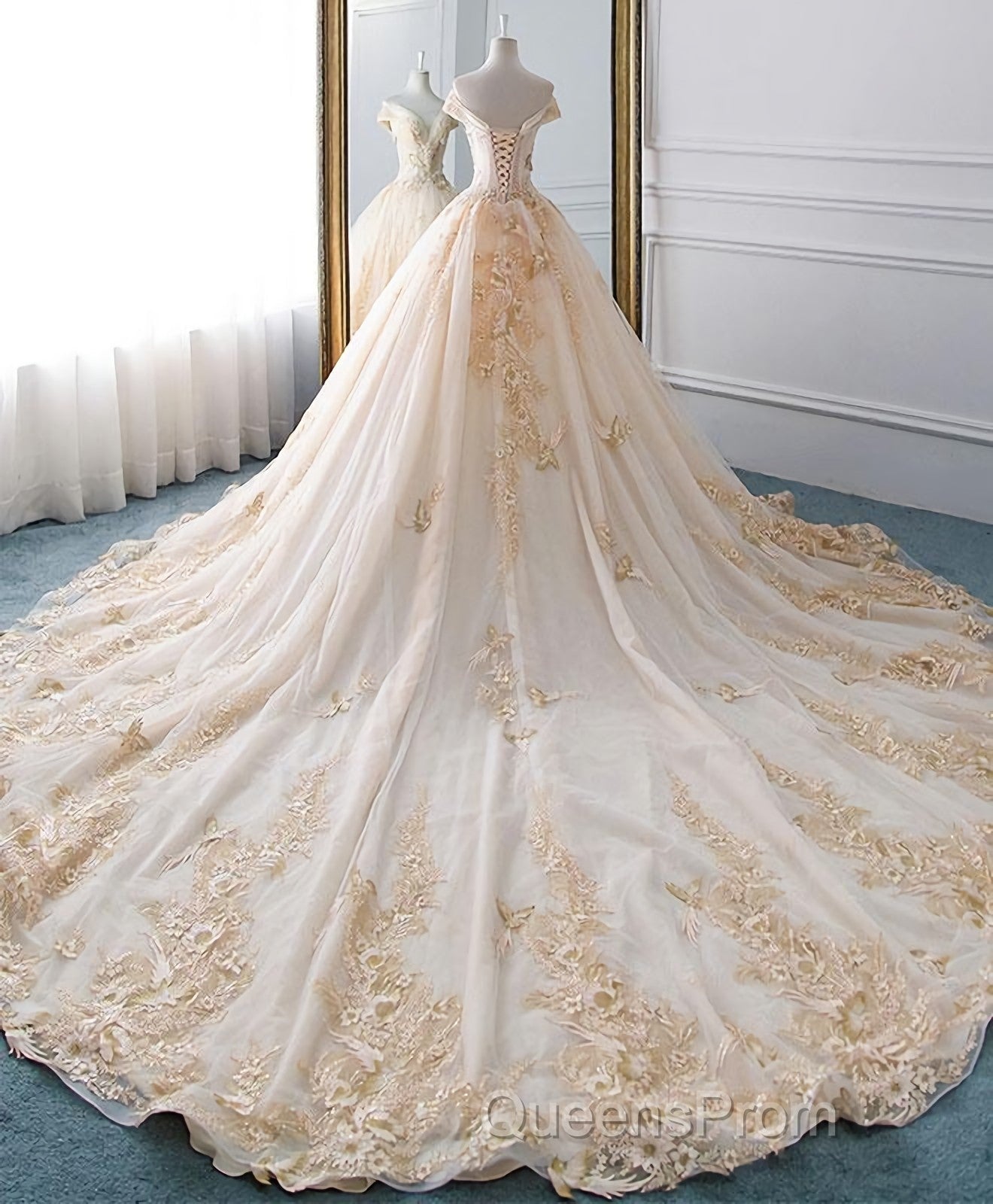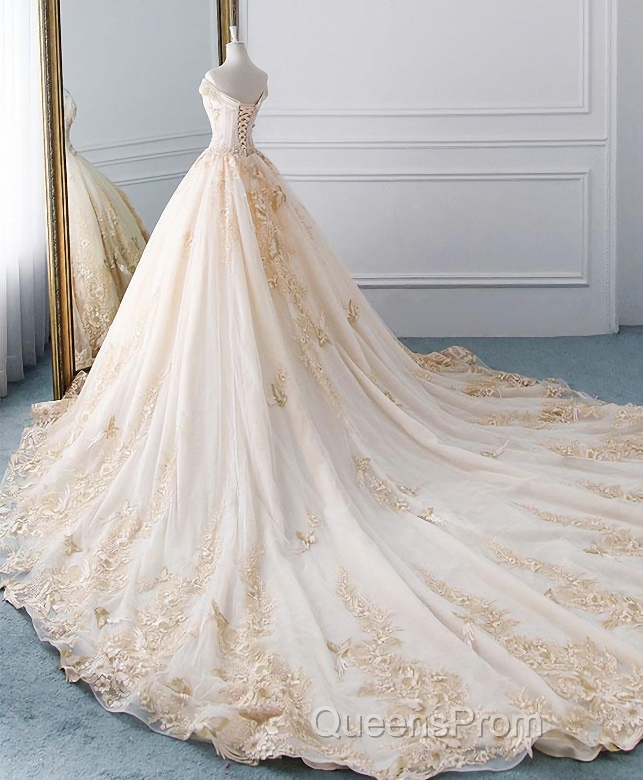 Unique Champagne Tulle Lace Long Wedding Dress, Bridal Gown
