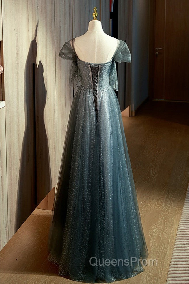 Unique Ink Blue Spotted Off Shoulder Short Sleeve Sequin Ball Dress Ink Blue A-Line Off Back Tie Bow And Floor Length Evening Prom Dress