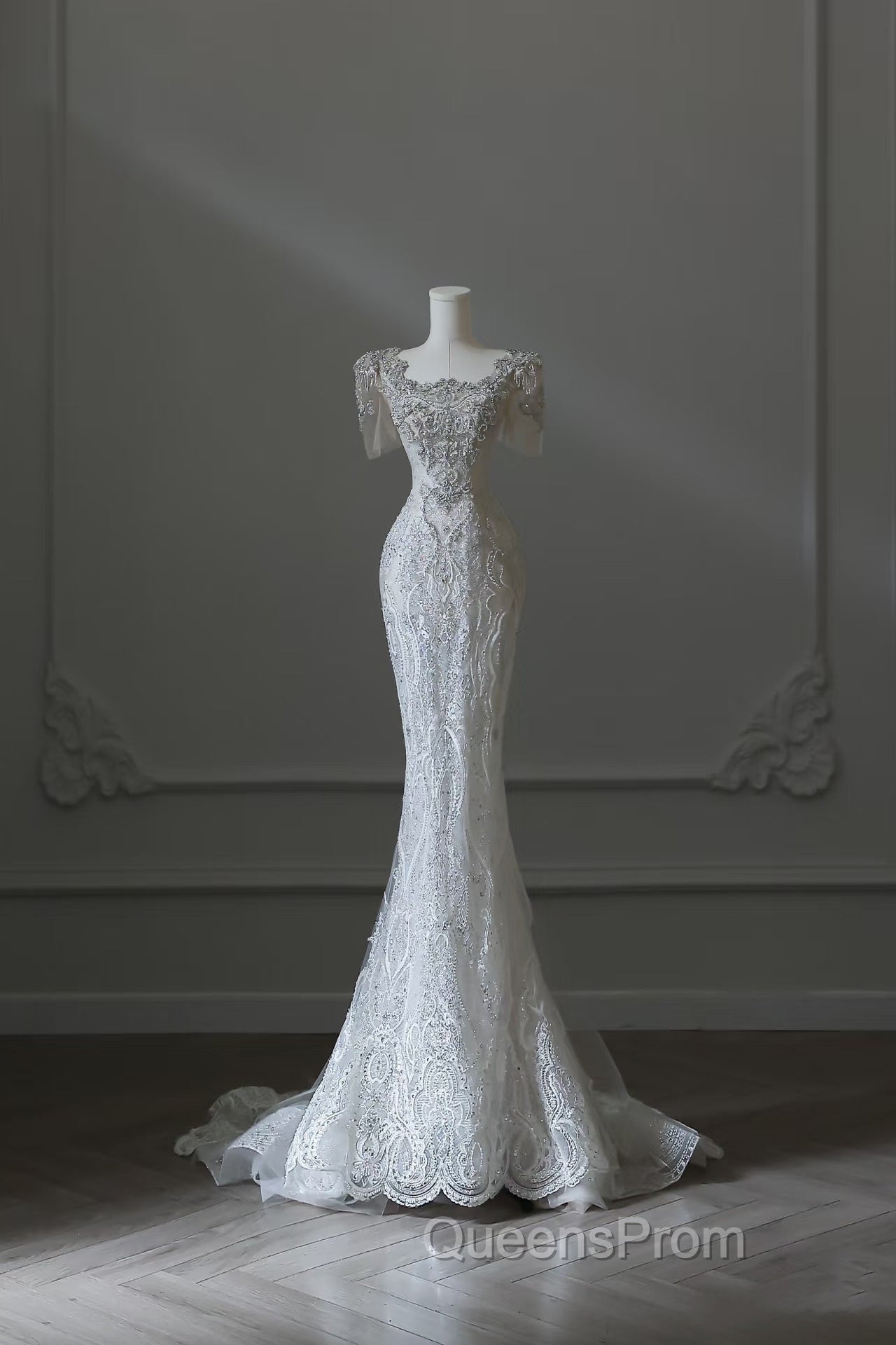 Unique Mermaid Square Neckline Short Sleeves Wedding Dress White Brides Dress