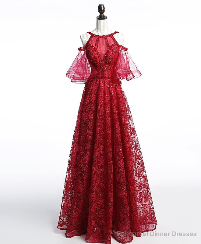 Unique Off Shoulder Tulle Lace Burgundy Long Prom Dress, Evening Dress