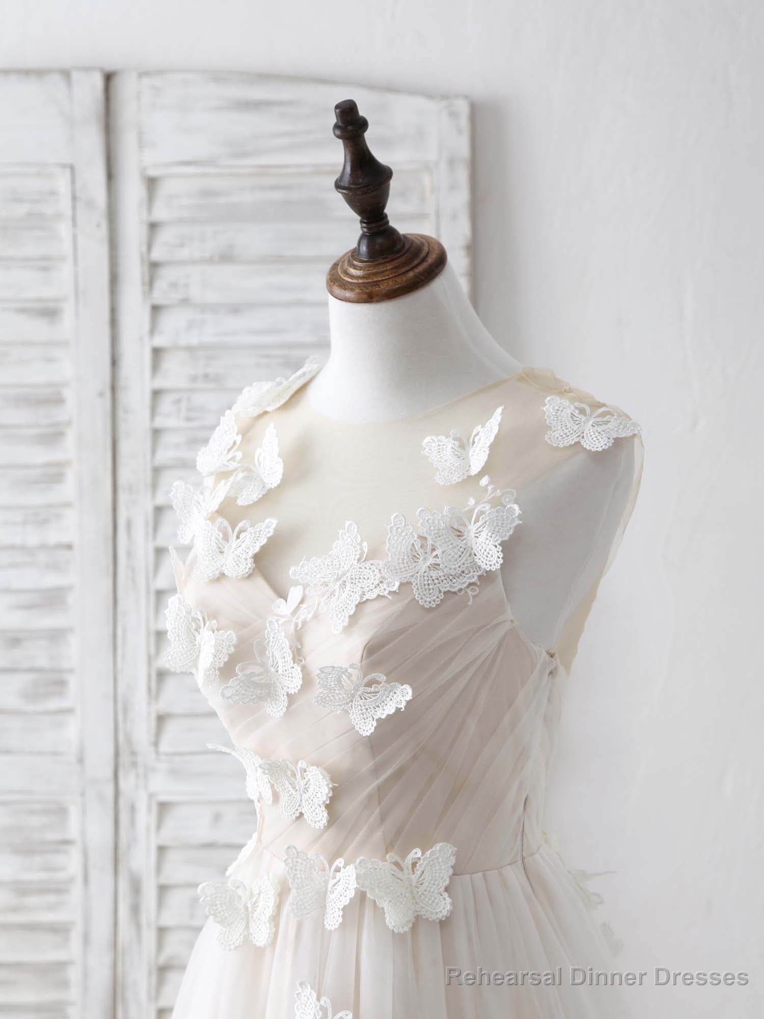 Unique White Round Neck Tulle 3D Lace Applique Long Prom Dresses