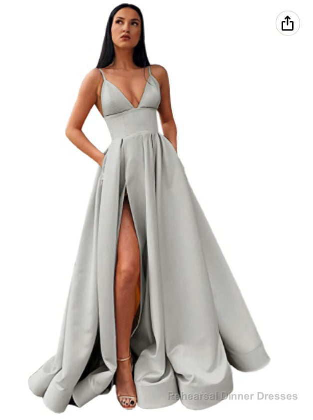 V-Neck Slit Satin Long Prom Dress Spaghetti Strap Evening Ball Gown with Pockets