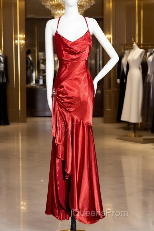 Vintage High Low Halter Satin Red Evening Prom Gown Fairy Long Evening Prom Dress