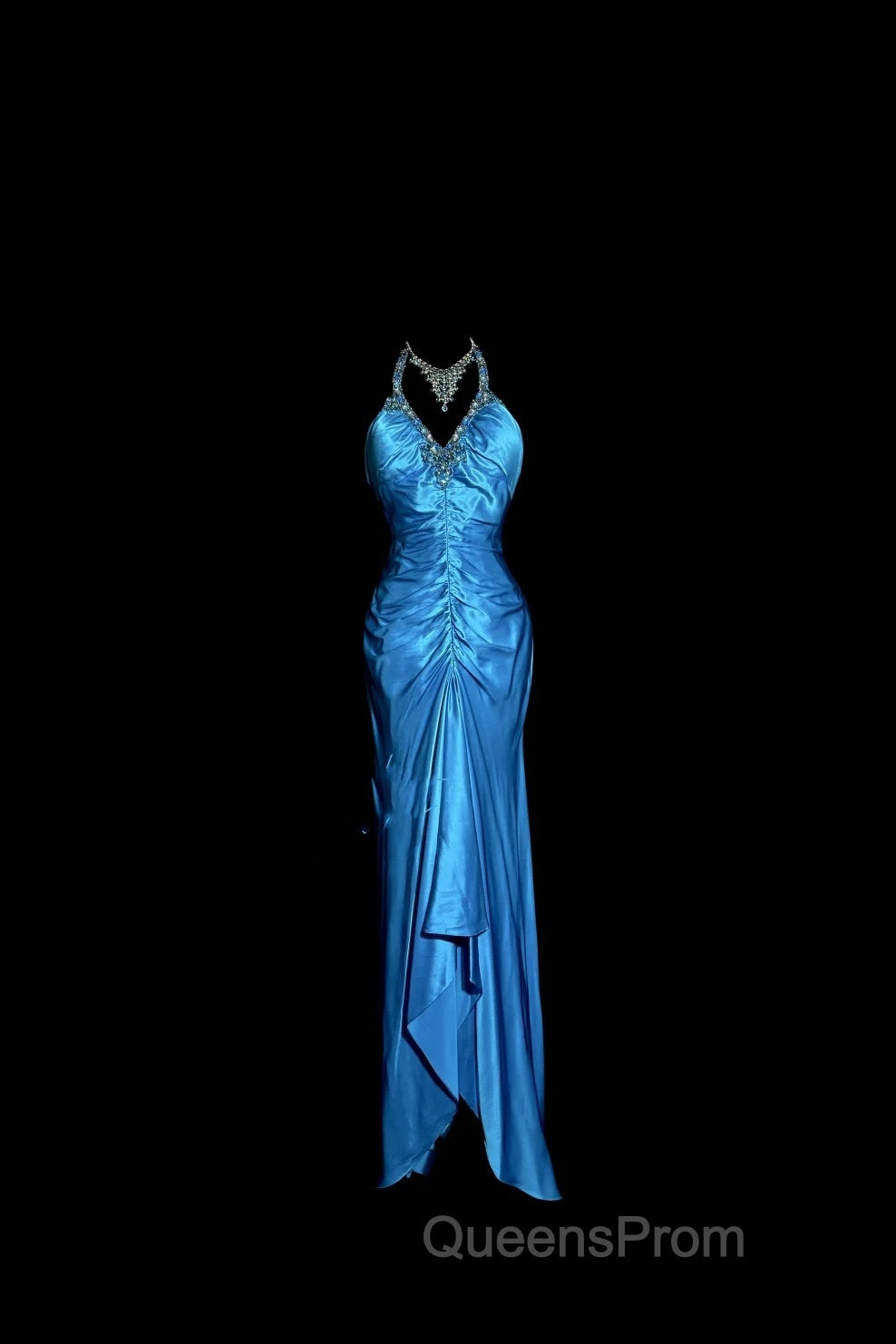 Vintage Mermaid Halter Neck Royal Blue Satin Backless Evening Prom Gown Fairy Evening Prom Dress