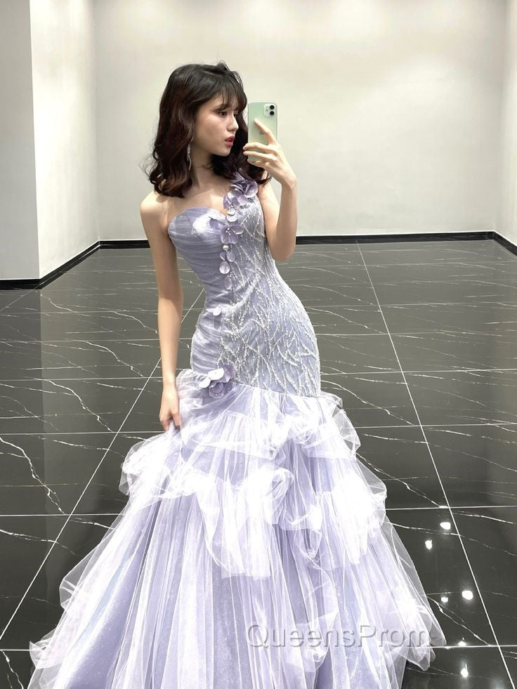 Vintage Mermaid One Shoulder Lilac Tulle Satin Long Evening Prom Dress Party Dress
