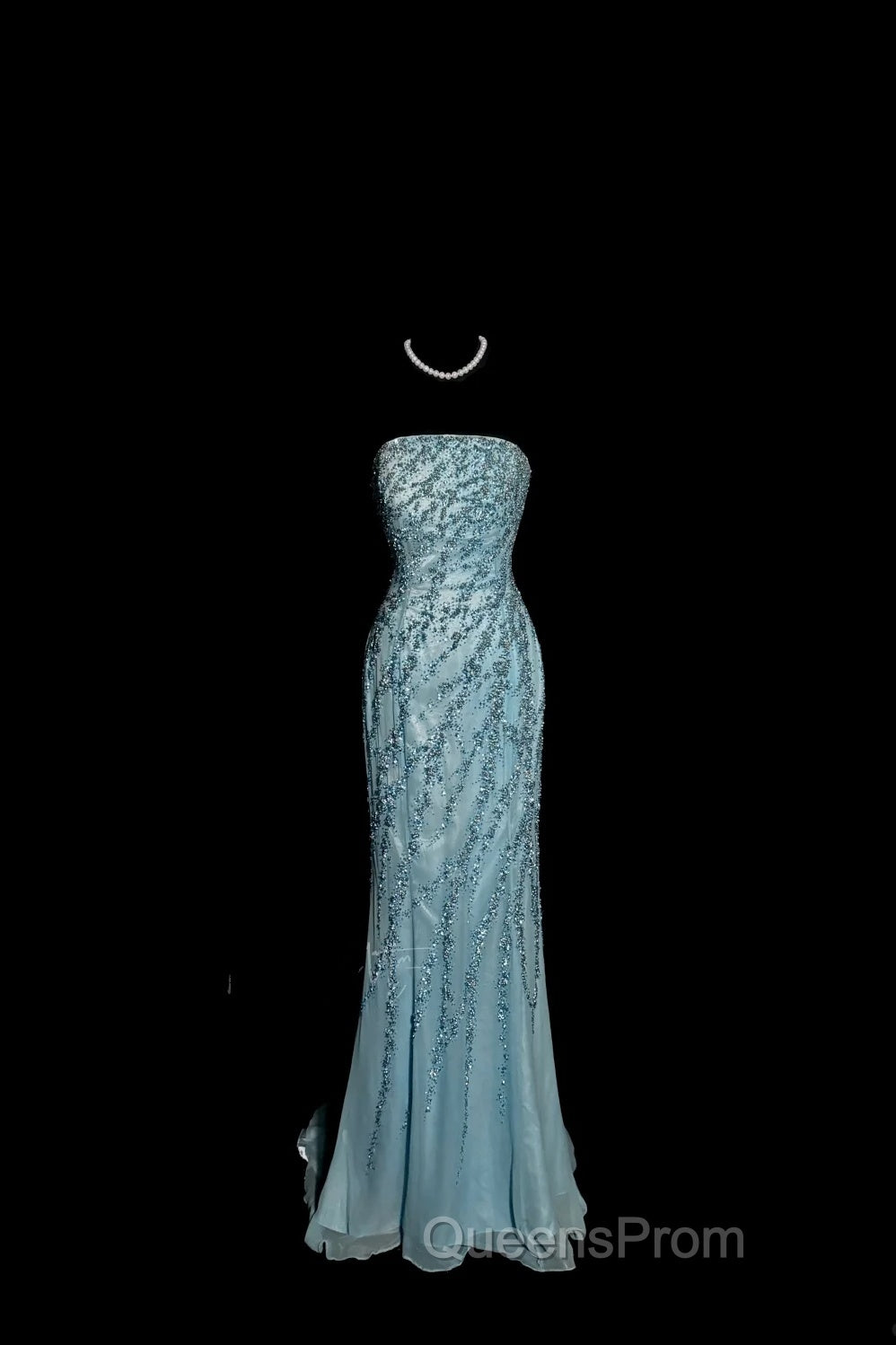 Vintage Mermaid Strapless Tulle Blue Beads Long Evening Prom Gown Fairy Evening Prom Dress