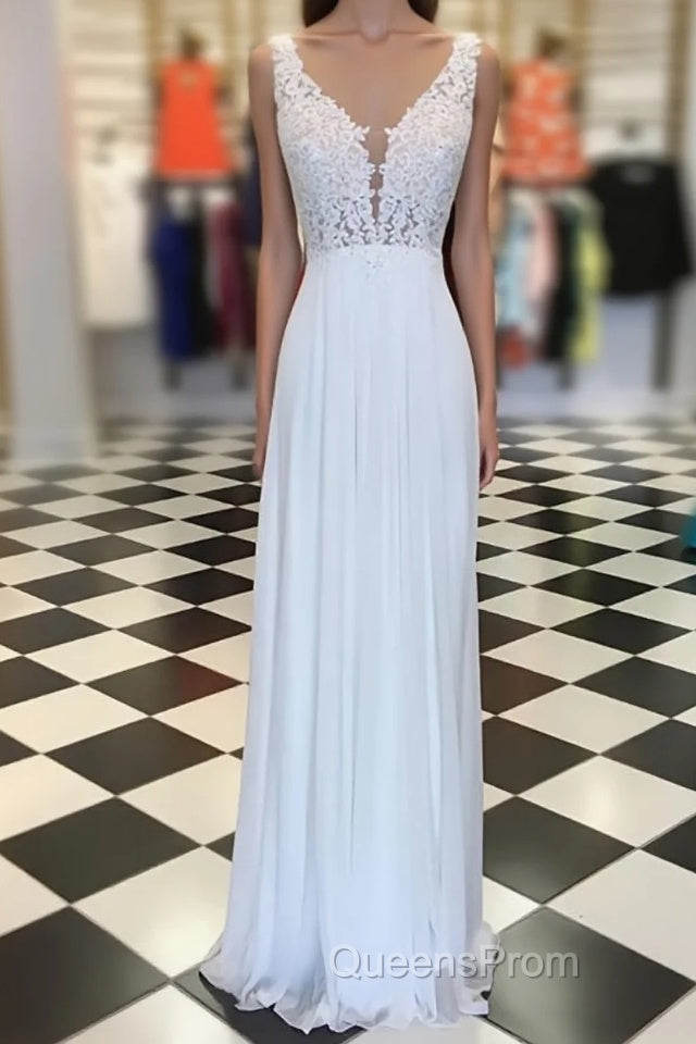 White A-line chiffon lace long Evening Prom Dress, white bridesmaid Dress