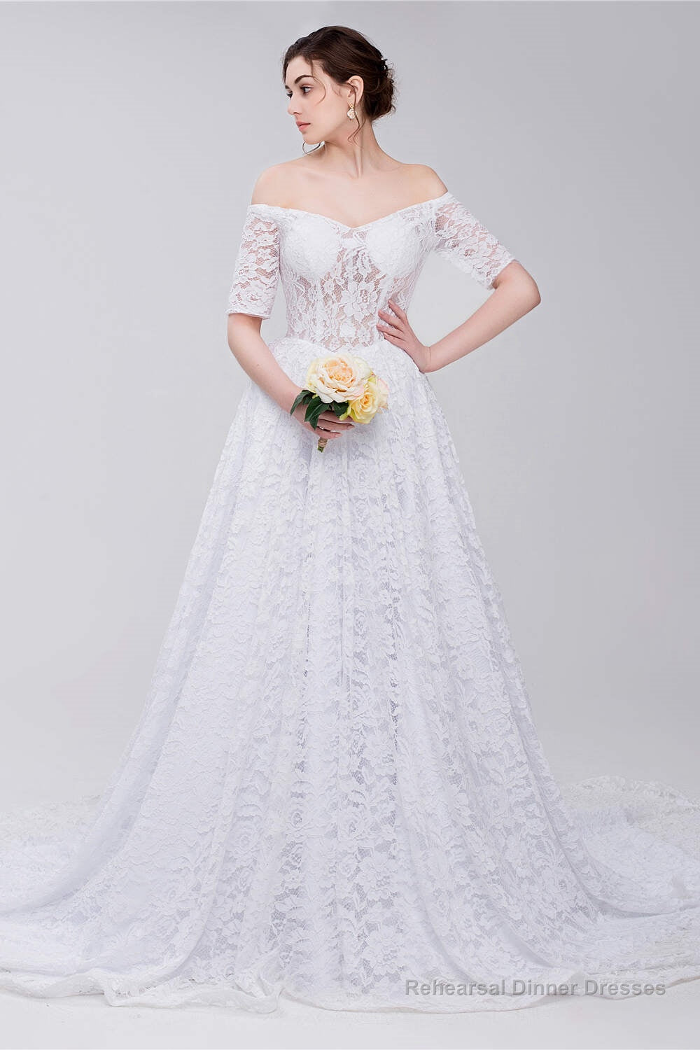 White Lace Off The Shoulder Short Sleeve Corset Wedding Dresses