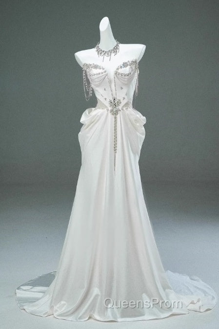 White Satin A-Line Sweetheart Beaded Long Evening Prom Dress, Elegant Adult Ceremony Graduation Evening Prom Dress