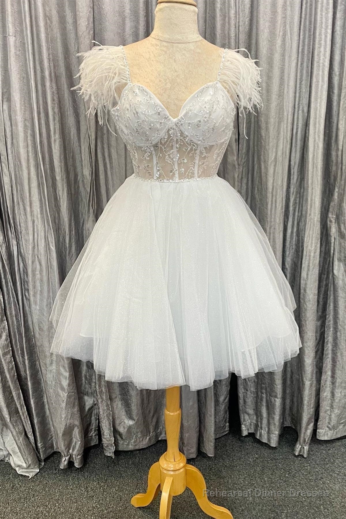 White Sweetheart Feathers Appliques Tulle Homecoming Dress