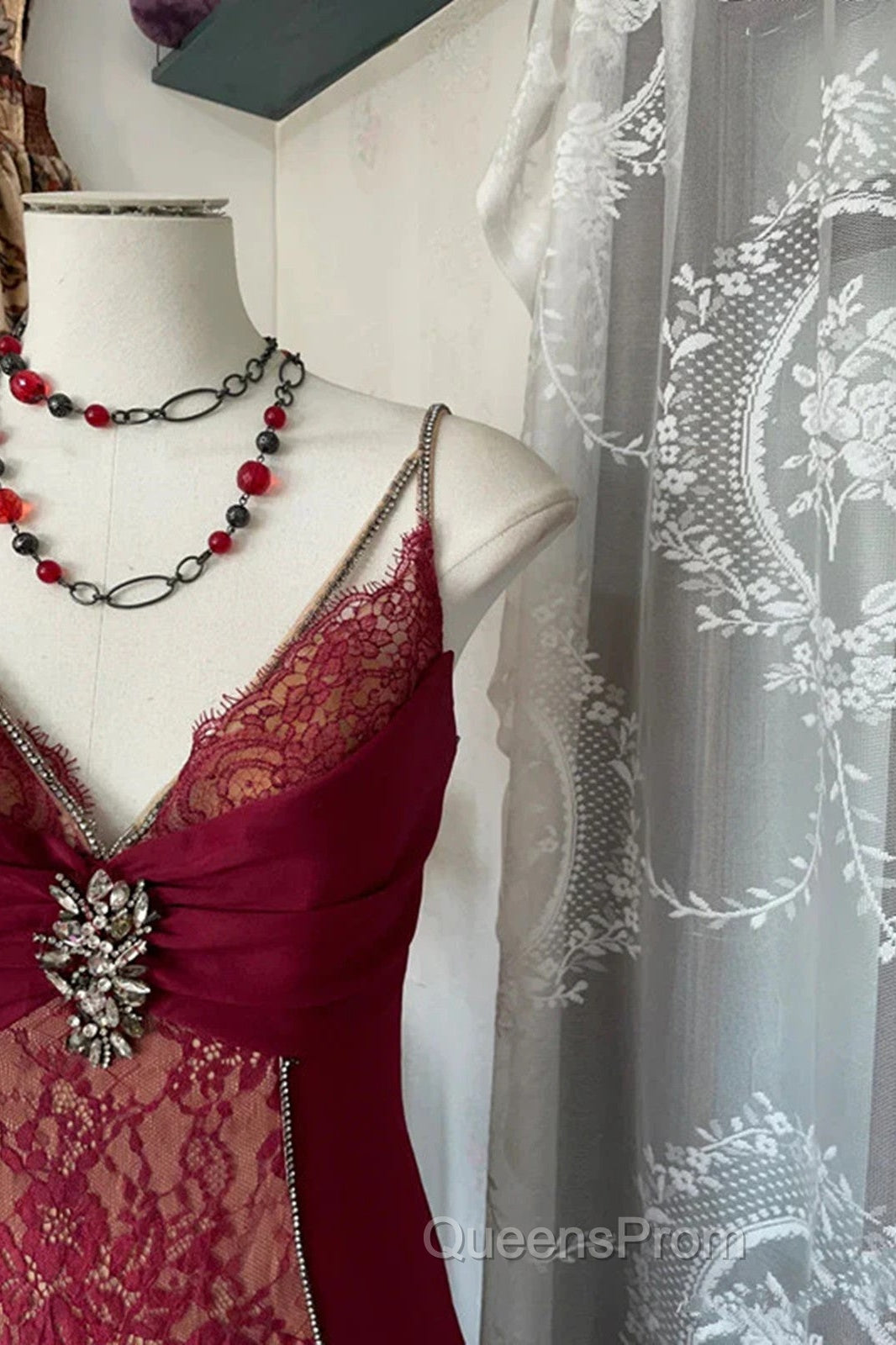 Wine Red Mermaid Straps Sweetheart Party Dress, Wine Red Lace Evening Prom Dress