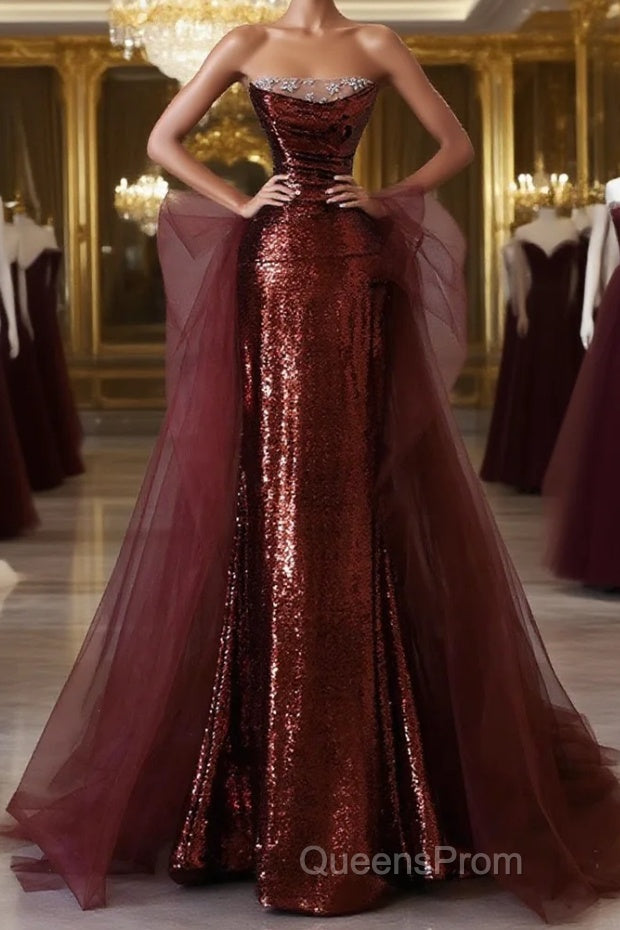 Wine Red Sequins and Tulle Beaded Long Party Dress, Wine Red Evening Dress