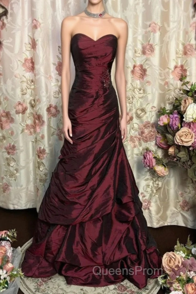Wine Red Strapless Long Taffeta Sweet 16 Dress, Wine Red Sweetheart Evening Prom Dress Formal Gown