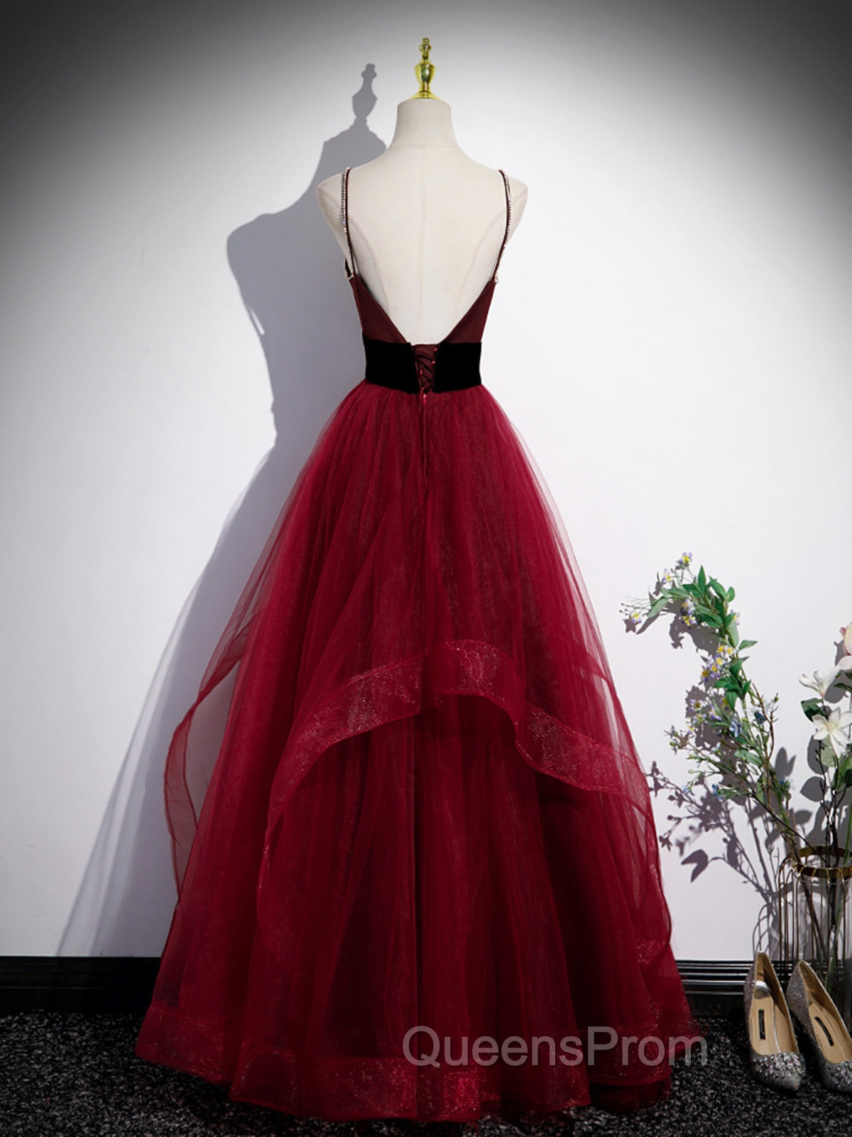 Wine Red Straps Beaded Sweetheart Tulle Formal Dress, Wine Red A-Line Evening Prom Dress