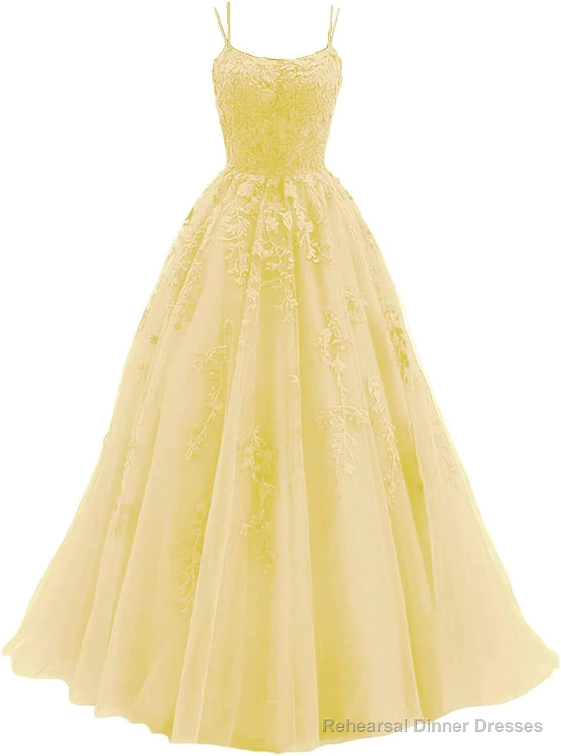Womens Lace Appliques Prom Dresses Long Spaghetti Strap Ball Gowns Tulle Formal Dress for Party