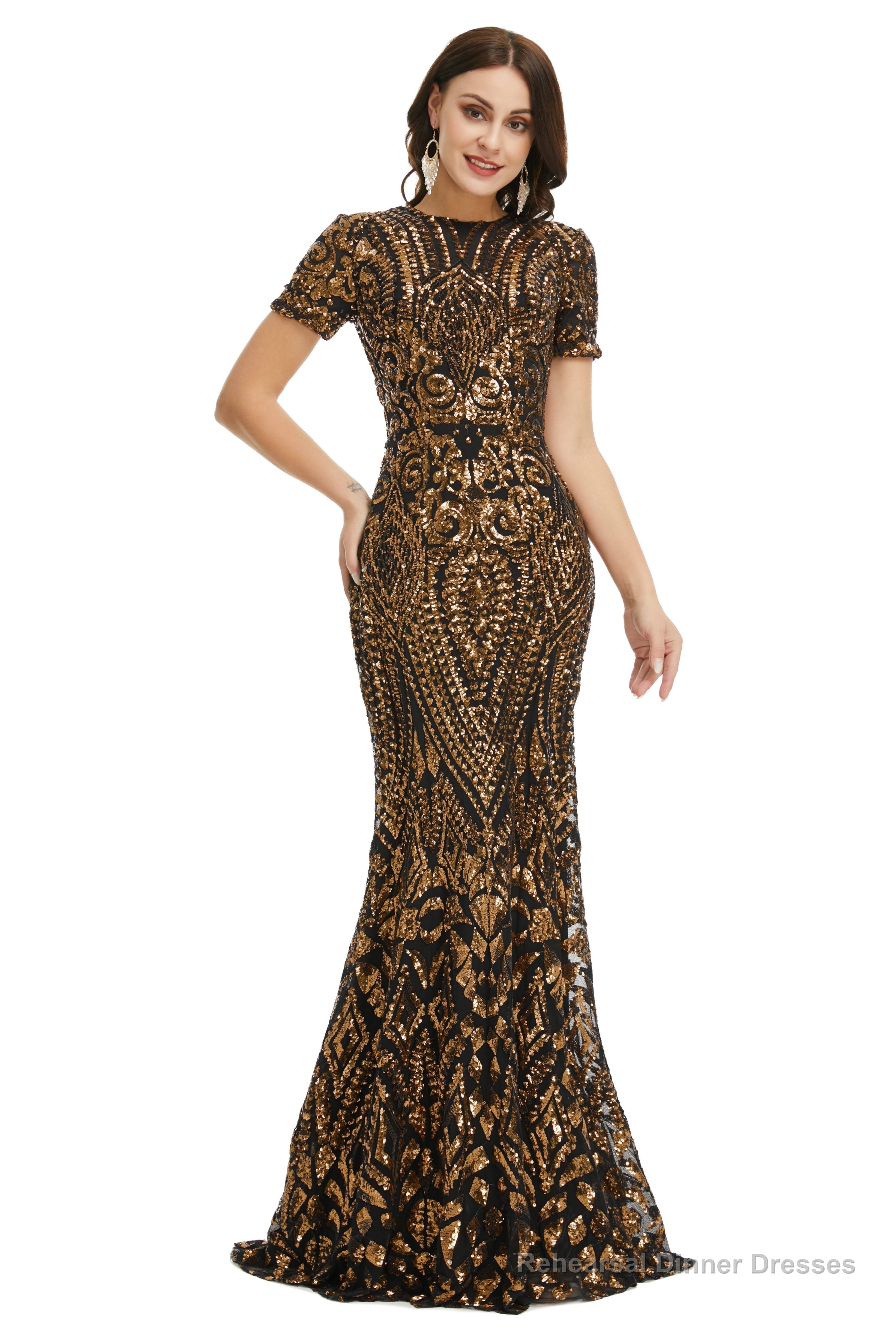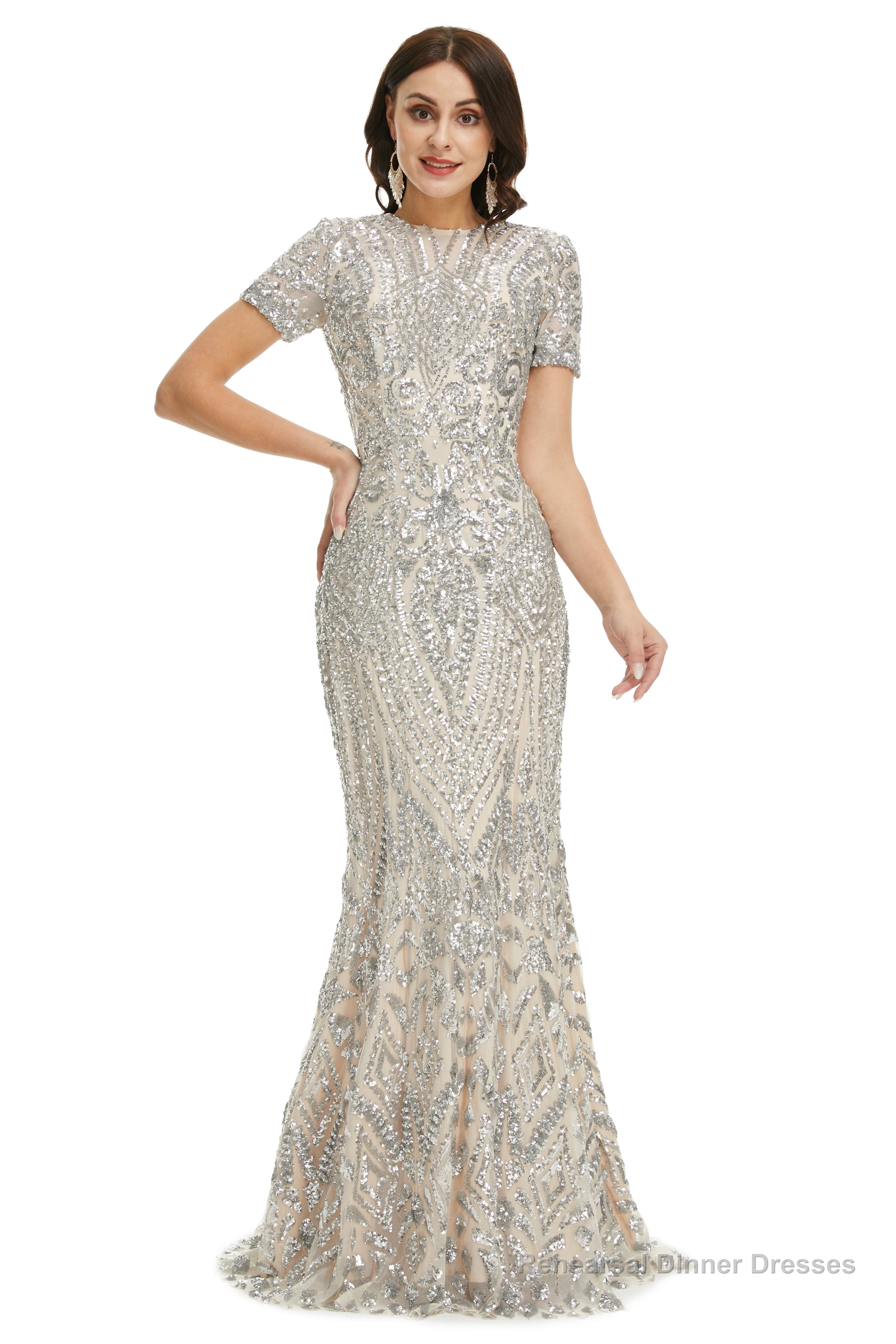 Short Sleeves Sequins A-Line Formal Evening Dress