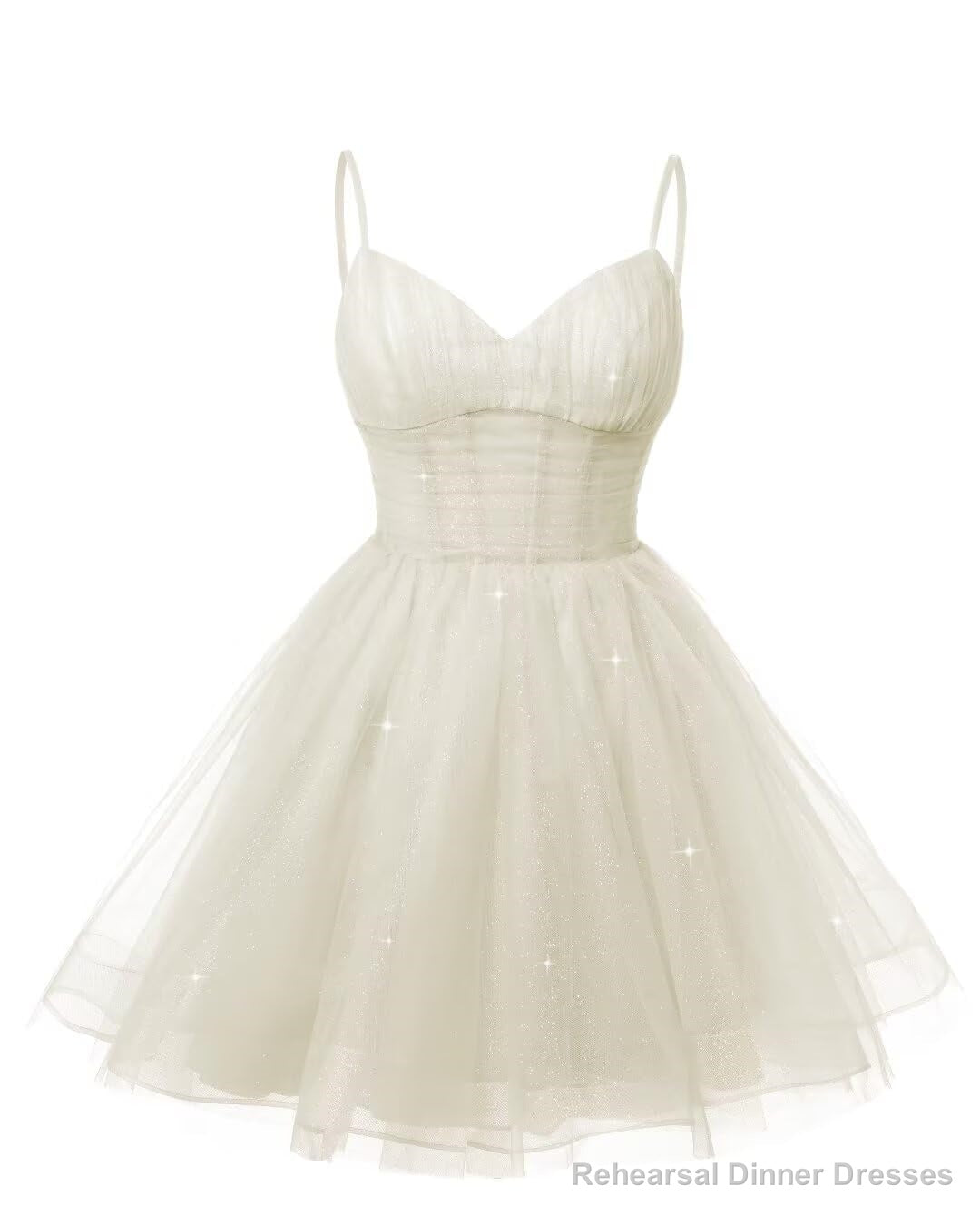 Womens V Neck Tulle Spaghetti Straps Ivory Homecoming Dresses with Corset Back Short Prom Gowns for Teens