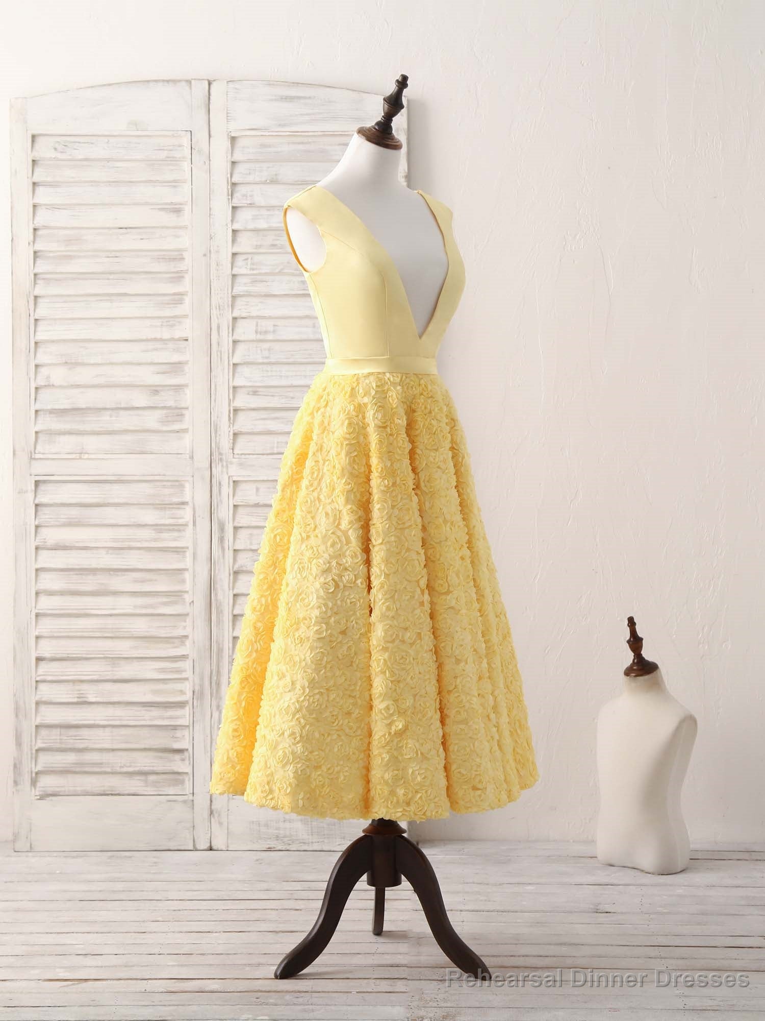 Yellow V Neck 3D Lace Tea Long Prom Dress, Yellow Evening Dress